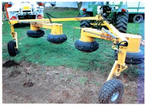 "There's never been anything like it. It's the rake of the 90's - unique and trouble-free," says Nico Sieling, inventor and manufacturer of this new "maintenance-free" 3-in-1 rake that can be quickly configured to work as a side rake, V-rake or tedder.