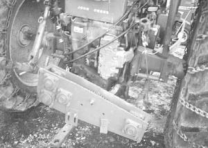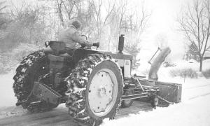 His front-mount 7 1/2-ft. Lucknow snowblower is driven off a shop-built transfer case mounted on the rear pto shaft. A 10-ft. driveshaft built from Schedule 80 pipe runs from the transfer case, which re-verses direction of the output shaft to accommodate front-mounting, under the rear axle up to the right front side of the tractor. A bearing in the middle of the shaft helps to support it.