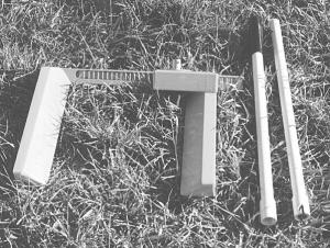 To use the chock you place both parts alongside the tire, then use a plastic tubular handle equipped with a J-hook at the bottom to move both chock parts against the tire at the same time.