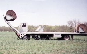 The loading arm is fitted with a pair of bale forks that lift bales into a sliding "bucket" that carries them up onto the deck where two additional buckets - one located on each side of the deck - carry the bales to the back of the deck.