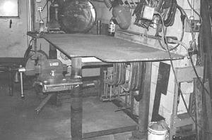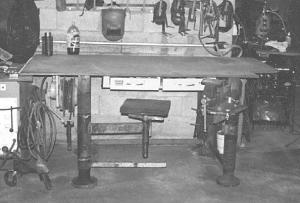 James L. Cotner, Danville, Penn.: "I built a heavy-duty welding table that's unlike anything I've ever seen. The top is 7 ft. wide and 42 in. deep and is made out of 1/2-in. thick steel steel. It mounts on 4-in. dia. steel pipe legs. A large vise is welded to a larger 4 1/2-in. dia. piece of pipe that slips up and down one of the legs so it can be positioned wherever needed by simply tightening set screws. It's useful because I can raise it up above the table or align it with the top of the table.
