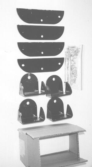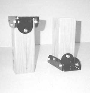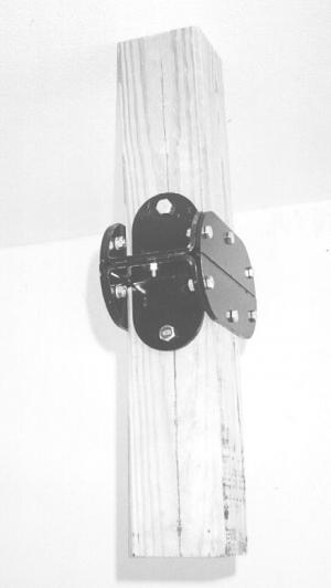 The steel brackets are designed to bolt onto a 4 by 4 wood post and consist of four front and rear pieces as well as four side pieces. The idea is to cut the post off 3 in. above the ground and put matching brackets on the stub in the ground and on the cut-off post. Then you put the post back together with breakaway pieces that go through the front and back of the brackets.