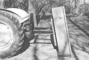 He used 1/8-in. thick steel to make a 4-ft. sq. box with 12-in. high sides and a tailgate on back. The bottom center part of the box hinges on a pair of 1 1/2-in. wide steel arms welded to a triangle-shaped bracket that mounts on the 3-pt. Walsh welded a pair of angle irons to the bottom side of the box, one on each side. A pair of 3/4-in. bolts run through the angle irons to form the hinge points.