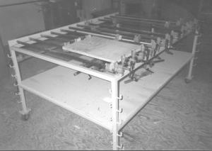 "The metal table is 4 ft. wide and 6 ft. long and mounts on four caster wheels. The 4-ft. long clamps on top of the table are spaced about 8 in. apart and fit through holes drilled into one side of the table. The handle end of each clamp has a hole drilled into it, allowing the clamps to be fitted over small metal tabs welded onto the opposite side of the table.