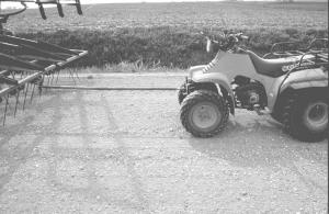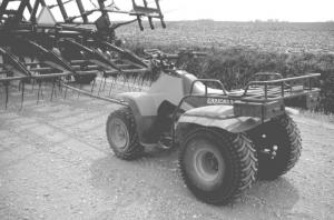 "It's a simple idea but it really comes in handy," says Anderson. "I farm alone with about 700 acres scattered out, so I use it all the time to get home. I've even pulled it behind my pickup at speeds up to 55 mph. When I get to the field I drop off the equipment and ride the ATV back home to get whatever else I need. The hitch comes off in just a few seconds. If I want, I can unpin the pipe and use a clevis to store it on the ATV rack.