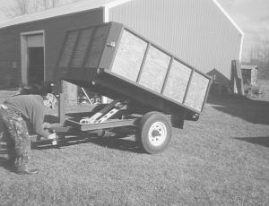 The 6 by 8 by 3-ft. deep trailer easily hauls 2 1/2 tons. What makes it unique is that he uses a cordless drill to power the dump box.