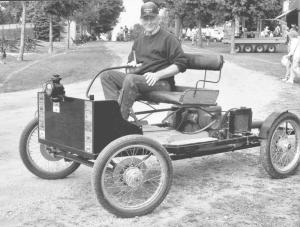 Gary Lund, Redwood Falls, Minn., built his own replica of a 1896 Ford Quadricycle. It's powered by an International Harvester single cylinder, 1 1/2 by 2 1/2 hp gas engine built in 1940. The engine belt-drives a countershaft which belt-drives a 3-speed Peerless transmission off a riding mower. The radiator is from a snowmobile and is located off to one side. The wheels are off a Suzuki motorcycle . The front axle is from a Model T Ford with 6 in. cut out of the middle.