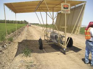 The trailer is moved along the field where crews are working, Edwards says. To facilitate ease of moving, each shade is on a cable that will collapse into the center so that a string can be tied around it to prevent wind damage.