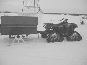 Bob Coppock owns a WW II army surplus trailer that he pulls behind his ATV. The Alberta veterinarian wanted to use the high-clearance trailer on snow so he asked a neighbor if he could design skis for it. "I have a set of Mattrack tracks on the ATV, which I ordered direct from the factory in Karlstad, Minn., and the skis follow exactly in the tracks," says Coppock.