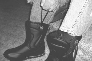 "I use the grommets in two ways," says Marley. "When I'm home and can keep the boots within easy reach, I use a couple of assists that were cut from plastic clothes hangers. When I'm away from home I get a lot of help with shoe laces that I leave in place. It takes a little more bending this way, but it's still a lot of help."