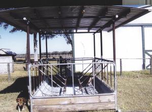 Homebuilt Covered Hay Feeder LIVESTOCK Feeding Equipment 32-5-41 I made this covered hay feeder to save hay and keep bales dry. It measures 11 by 6 1/2 ft. with a 15 by 15-ft. roof over the top and a metal floor. The main frame is made of 2 3/8-in. drill pipe while the dividers are 1-in. sucker rods. Gates at each end swing open to load bales. The 2 by 8 boards lift out on each end to clean out. (Benjamin Stolarski, Sealy, Texas ph 979 885-6786)