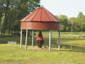 The gazebo has a cobblestone floor with 6-ft. high fence panel sides. There's a free-standing fireplace in the middle of the floor. A 6-in. dia. flue pipe runs up through the center of the roof.