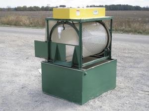 Willsie's washer consists of a 26-in. dia., 3-ft. long, rotating drum powered by a -hp motor. The drum sits in a frame over a 160-gal. tank for the recirculating water. The 55-gpm sump pump is set about 10 in. above the floor of the tank inside a screen. Most dirt and other material settle out of the recirculating water, but the pump can handle debris of up to 1-in. dia. A 2-in. dia. pvc pipe drilled with exit holes releases the water across the top of the drum.