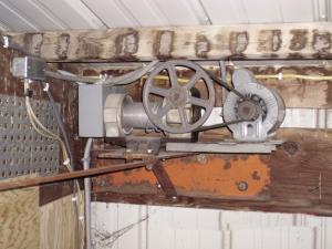 Nine hinges hang the door to the old header. The winch was installed inside the shop with cables running to pulleys on two outside lift posts. From the posts, cables run to the sides of the shop door.