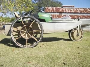 After all, it isn’t every day you see a Deere garden tractor looming above a 10-ft. long aluminum boat, churning through the water on big lugged rubber wheels. Nor will you often see a boat running on rubber wheels over dry ground.