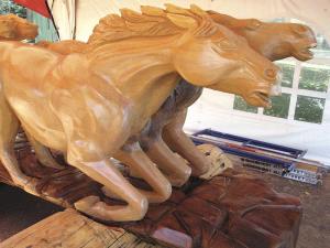 The carving was so large that he literally crawled under the horses to carve. He cut out a lot of wood between the legs and from the center of the log, which was soft in places. The 13 ˝-ft. long log was the third section of a tree cut on Vancouver Island.