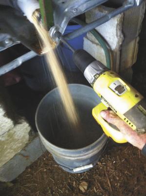 The square poly container mounts on cement blocks about 3 ft. off the ground. Baldwin uses the cordless drill and mini auger to pull a mixture of cracked corn, wheat, millet, and sorghum out of the container’s outlet into 5-gal. buckets.
