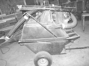 Getting a power unit was the easy part. He picked up a 50 cc Husqvarna leaf blower. The tougher part was deciding what to use for a vacuum vessel. He decided to use heavy-duty Rubbermaid utility cart tubs. The tubs had the volume and heavy-duty construction needed.