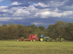 “It functions independently of the round baler and allows the operator to unload bales on the go so any bales on the BPS can be added to any existing group in the field,” Monahan says. “It lets you group bales together so you aren’t running over the whole field. And if you have steep hills you can carry bales to a level spot.”