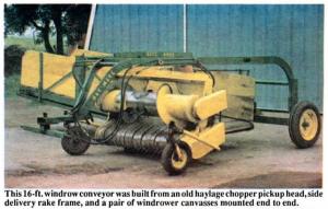 So they built their own 16-ft. windrow conveyor from an old Deere haylage chop-per pickup head, side delivery rake frame, and a pair of Versatile windrower canvasses mounted end to end.