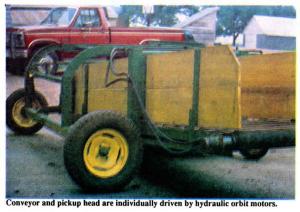 Height adjustment for the pickup head is controlled by the 3-pt. hitch. The conveyor and pickup head are individually driven by hydraulic orbit motors which are hooked up to two separate remote out lets on the tractor. "The operator can match ground speed to pickup and conveyor speed and pick hay up gently without bunching the windrow. We usually pick up one 16-ft. windrow and put it on top of the one next to it for a 32-ft. swath, or, by picking up a windrow on the other side, we can make a 48-ft. swath. Any small tractor equipped with a 3-pt. hitch and two remote outlets can operate it."