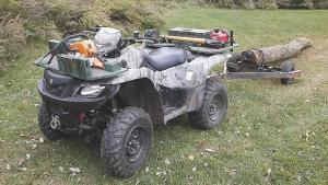 He uses his Suzuki King Quad 4-WD ATV to pull the 2-wheeled skidder, which rides on a pair of 10-in. wheels. The front end of the log is chained to a cross member located just ahead of the wheels.