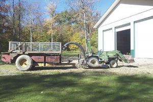 “The spreader is wider than the tractor so I offset the drawbar and manure spreader to the right, which allows me to pick up leaves close to a tree or house. For any areas that I can’t reach, I use a garden tractor equipped with a commercial leaf vac and then empty the full bags into the spreader.”