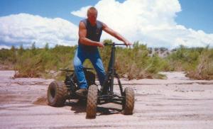 David Zuhlsdorf crossed a scooter with an ATV and made a stand-up, off-road vehicle like no other. The platform on wheels gives him more visibility than a conventional ATV and is just plain fun.