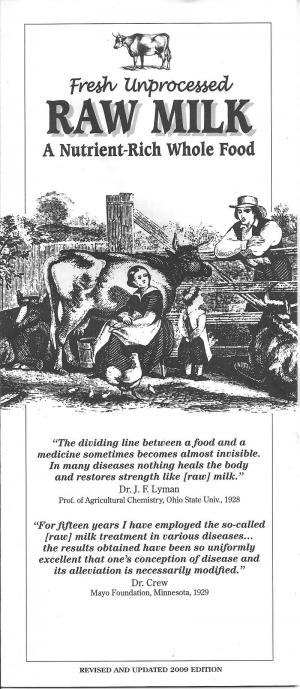 The brochure covers the benefits of raw milk and how it heals and restores health, the health hazards of processed milk and diseases associated with it, raising healthy cows on pasture, and also how raw milk is used by traditional cultures.