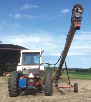 “The entire project ran about $2,200 with most of that being the pto-powered pump and the hydraulic motor,” says Heneghan. “I had previously replaced the manual crank with an orbital motor to raise and lower the auger. Everything can be done from the tractor seat.”