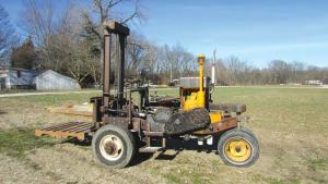 “Built-From-Scratch” Forklift Tractor MISCELLANEOUS EQUIPMENT Forklifts “I use it to haul logs stack firewood and for many other jobs ” says Mark Rahn who built a forklift tractor from scratch “It was a fun challenge In the end I probably could ve bought a used skid loader for less money than I spent to build it But it turned out great “The forks pin onto the mast in such a way that I can remove them and hook up to a stand-alone ball hitch assembly without ever getting off the machine ” Rahn says he s been mechanically inclined from childhood “For example one day when my dad was away from home I tore apart a push lawn mower and put it back together all by myself I was just 7 years old ” He started with the rear end and frame off a late 1970’s Chevrolet 1-ton dually pickup turning the frame backward so the rear axle and wheels were up front He mounted a pair of small implement wheels on the back spacing them closely together and turning them inward like the tricycle-type front wheels on older tractors The machine is powered by a hand-cranked 1945 LUC engine off a Deere combine Located behind the driver’s seat it powers hydraulic pumps that drive a pair of hydraulic motors One motor is connected to a 3-speed manual transmission off a 1960 Ford pickup and provides gear reduction for the front drive wheels The other motor off a David Bradley walk-behind tractor and still attached to the tractor’s gearbox is located behind the forklift mast Rahn removed the tractor’s wheels from the gearbox and installed a pair of sprockets in their place which are used to chain-drive the forks up or down A hand-made electric throttle controls the engine rpm’s and a foot-operated pedal controls the machine’s speed “The forklift has a lift capacity of about 1 200 lbs One lever tilts the mast forward and backward and another raises and lowers it ” says Rahn “A pair of master cylinders off an old pickup provide independent left and right brakes ” The steering wheel is off a 1940 Model A tractor “The steering system is complicated and took me a long time to figure out ” says Rahn “A chain connected to the steering wheel drives a pair of sprockets which chain-drive a driveshaft that goes back to a right angle gearbox that’s connected to more chains and sprockets ” The machine is equipped with LED lights on the front and back and over the steps The seat is off another David Bradley tractor Rahn says he plans to build another stand-alone attachment for the tractor - a lift adapter that will make it easy to work on his riding mower Contact: FARM SHOW Followup Mark Rahn 7342 Gum Spring Lane Ellis Grove Ill 62241 ph 618-615-6659; markrahn66@gmail com