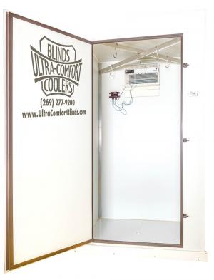 The cooler provides space for hanging up to five deer or a large quantity of meat or garden produce. It operates off 110 volts and pulls 5.9 amps while running. It can be powered by a small generator if it’s used in a remote area.