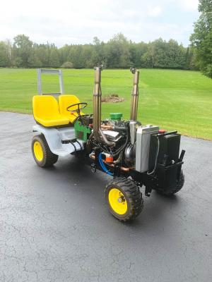 One of the difficult issues with his project was that lawn tractor engines rotate counterclockwise while automotive engines rotate clockwise. Brotzman says he thought about that a lot and finally decided to mount the truck engine with the flywheel facing forward and the water pump and fan facing the back of the tractor.