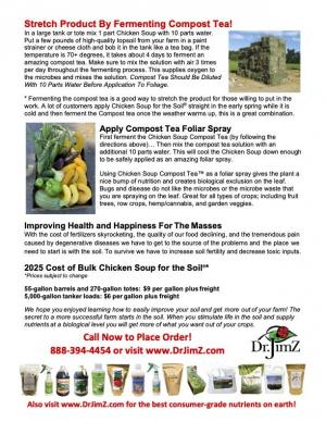 * Fermenting the compost tea is a good way to stretch the product for those willing to put in the work. A lot of customers apply Chicken Soup for the SoilŪ straight in the early spring while it is cold and then ferment the Compost tea once the weather warms up, this is a great combination.