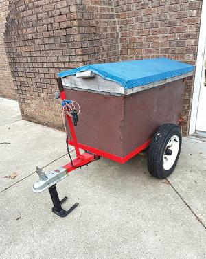 “I mounted the actuator between the rear axle and the front of the box, just like a hydraulic cylinder is mounted under a gravel truck box,” says Carra. “A knob on the front of the cart releases the tailgate.”