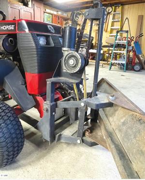“I built push arms out of 2-in. channel iron and pinned them to existing holes in the frame, just forward of the rear wheels,” says Carra. “At the front of the tractor, the blade frame rests against a block mounted to the original front deck mower mount. It keeps the blade frame square.”