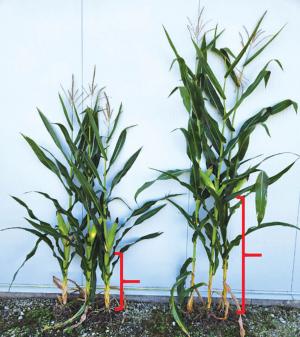Purdue University researchers found that short-stature hybrids averaged 67 in., compared with 86 in., with average ear heights of 22 in. versus 37 in. At the same time, the average above-ground total plant biomass was roughly the same at the R1 growth stage.