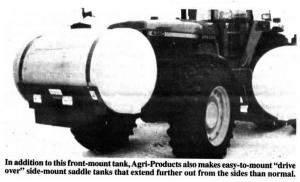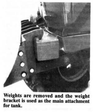 Agri-Products, Inc., York, Neb., has designed an "easy-to-mount" front saddle tank that hooks over the tractor weight brackets, eliminating the need to do a lot of bolting. You remove the weights and use the weight bracket as the main attachment for the tank. The six hooks that slip over the weight brackets are made from 3/4-in. thick steel plate. Side braces bolt to the tractor frame.