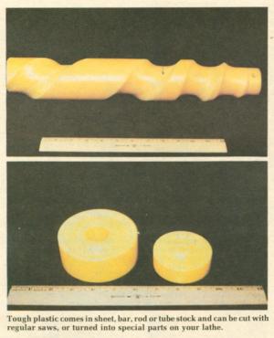 He notes that Ang-Alloy purchased in sheet, bar, rod or tube stock is easy to cut to size with conventional wood or metal saws. Special gears, pulleys or other parts are easily turned out on wood or metal lathes. "If you've been able to locate a certain metal gear or other part for an older piece of equipment, or if a certain metal part keeps wearing out and having to be replaced, you may be able to have a duplicate part machined out of Ang-Alloy. If you don't have a lathe, a local machine shop may be able to do it. The cost should be a lot less than having the same part machined out of metal," suggests Mascott. "Our new product can also be used to fabricate such items as bearing blocks and shields, chain guides, cam guides or worm screws."