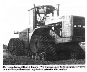 Rubber tracks are a natural for articulated 4-WD tractors. The two sets of tracks turn independently so they don't mound up dirt on headlands," says Fred Riplo. "Ground speed is limited to 10 to 12 mph because the drive sprocket on the tracks isn't as big as the drive sprocket on the tractor wheels. These tracks can't be used on combines because they're too small to provide ad-equate flotation (Gilbert & Riplo has other tracks for combines). We custom manufacture the tracks for different tractor makes and models due to differences in wheel hubs, planetary drives, and axles.