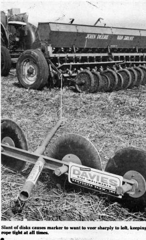 "It also works great for back and forth work," explains Boyd Davies, marketing director. "In this case, the rope is attached to the center of the implement. After the tractor turns to go back in the opposite direction, the rope pulls tight and the marker automatically flips over and, because of the slanted angle of the discs, immediately runs to the other side an equal distance."