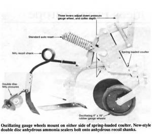 The cultivator can be used to side dress liquid fertilizer. Fertilizer is delivered through a tube to the end of each sweep where it's deposited on each side of the row. It can also be used as a high residue liquid fertilizer or anhydrous ammonia applicator. New-style double disc anhydrous ammonia sealers bolt onto the back of anhydrous recoil shanks to keep anhydrous from escaping. The double disc sealers sell for $75 apiece.