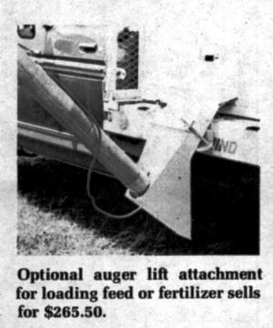 Powered by the truck's electrical system, a 12 volt Delco motor moves a 31/2 in, drag auger to pour range cubes, pellets or grain at a rate of 6 to 10 lbs. per second. A toggle switch mounted under the dash lets you fill feed bunks, or pour directly onto the ground as you travel, measuring precisely the amount desired. An optional 4 in. auger lift attachment makes for easy filling of grain boxes, grain drills, or corn planters hoppers, Remias points out.