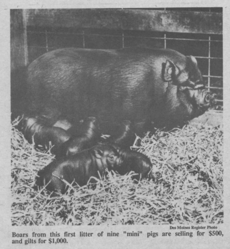 Robert Briggs and his wife, Nancy, bought the hogs in August, 1986 from exotic animal dealer Dave Hale, Cape Girardeau, Mo. At that time they were two of only 27 Vietnamese hogs in the U.S. Hale originally brought his breeding stock to the U.S. from Canada.