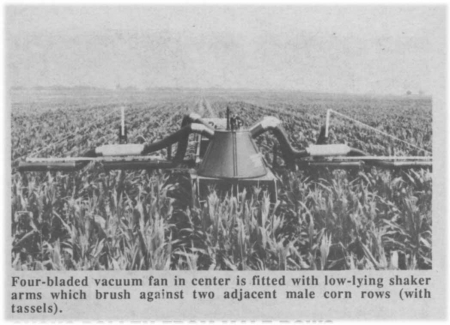 The machine consists of a large vacuum fan at center, fitted with low-lying shaker arms which brush against two male rows of corn. The machine sucks up whatever pollen comes loose and distributes it out along a blower pipe to three female rows on either side of the, vacuum fan. Four drop pipes hang down on either side of the female rows. Pollen blows out the drop pipes, striking "difuser" plates that direct pollen toward the female ears.