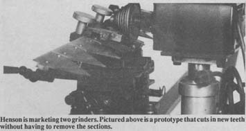 Henson is offering a one-disc, hand-held grinder that grinds one tooth at a time and can be used to sharpen individual sections without removing them from the sickle, and a stationary seven-disc model that cuts in seven new teeth per bite and requires that individual sections be removed from the sickle for sharpening.