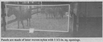 Tice says you can tie as many sections together as needed. They're made of inter-woven nylon with 1 1/2-in. sq. openings -- too small for a horse to get a hoof caught in. They've got a vinyl border fitted with tie-down grommets. Tear strength of each strand is 320 lbs.
