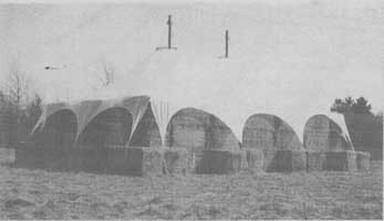 The walls are made from 4 by 8-ft. square straw bales with wire panels protecting the inside surface. The roof consists of a pre-formed reinforced plastic tarp supported by center masts and secured to the ground by ropes. One, two and three-mast versions of the big bale tent are available requiring 24, 52, and 64 bales respectively. The interior is well-ventilated by gaps in the walls and by circular openings at the mast-heads which allow natural air movement but don't allow entry of rain and snow. Pigs can leave through a choice of exits and the interior can be deep-bedded with straw.