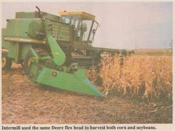 Based on his tests, Intermill says he thinks a short statured plant works best for solid-seeded corn when a flex head is used to harvest it because it allows the reel to reach the ears. He experimented with a 75-day, 4-ft. high Cargill dwarf hybrid that he planted at 42,000 seeds per acre (his goal was 50,000 seeds per acre). He says plant height isn't a concern when a corn head is used.