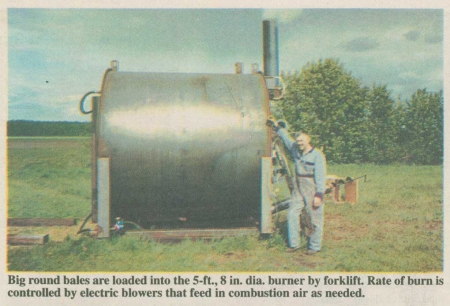 "We built a prototype in 1993 and burned eight big wheat straw bales in it that summer," says Harry Toews, inventor. "It worked better than we'd ever dreamed. The amount of smoke varies with the material you're burning and the moisture content of the bale. There are only a couple of pails full of ash left after burning because it burns so extremely hot. Ash is removed by an auger."